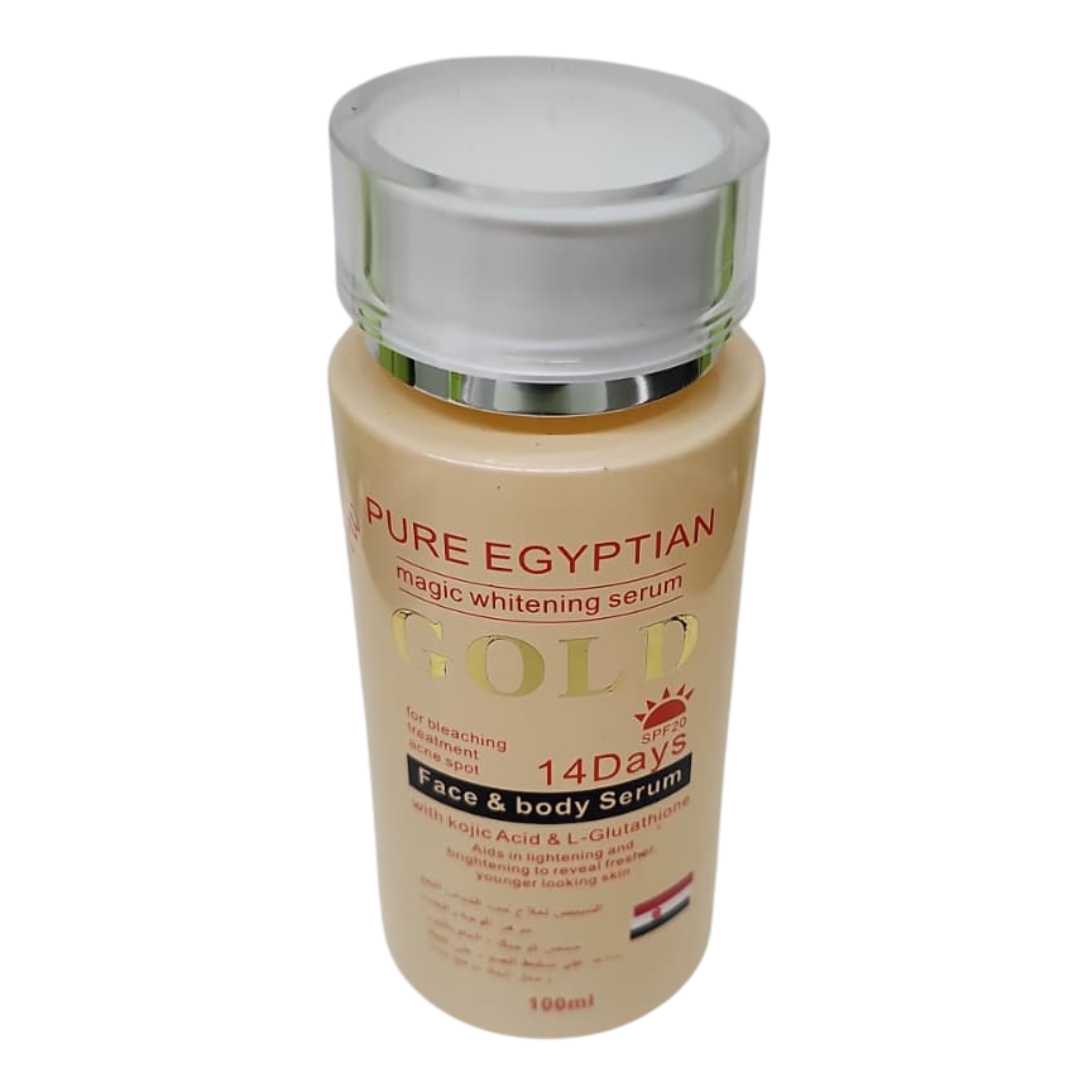 Transform your skincare routine with Pure Egyptian Magic Whitening Serum Gold, a powerful brightening formula designed to fade dark spots, even out skin tone, and reveal a visibly radiant glow. Enriched with Kojic Acid, L-Glutathione, and SPF 20, this advanced serum works on both the face and body, delivering fast results within as little as 14 days.