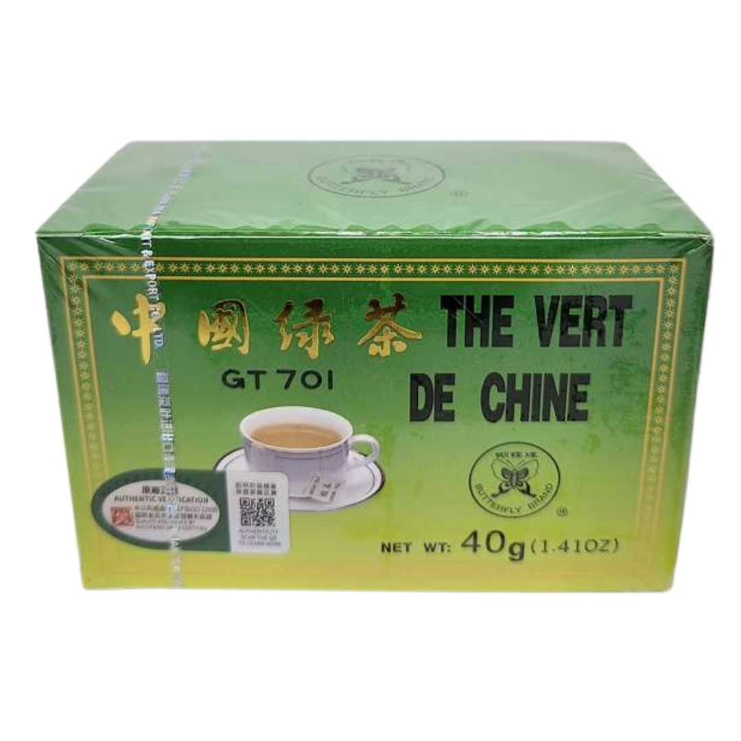 Enjoy the authentic taste of traditional Chinese tea culture with Thé Vert de Chine GT701 by Butterfly Brand. This vibrant green box contains 40g of pure green tea leaves, offering a smooth and refreshing experience in every sip. Its packaging features a classic teacup and elegant Chinese script, reflecting the heritage behind this beloved drink.